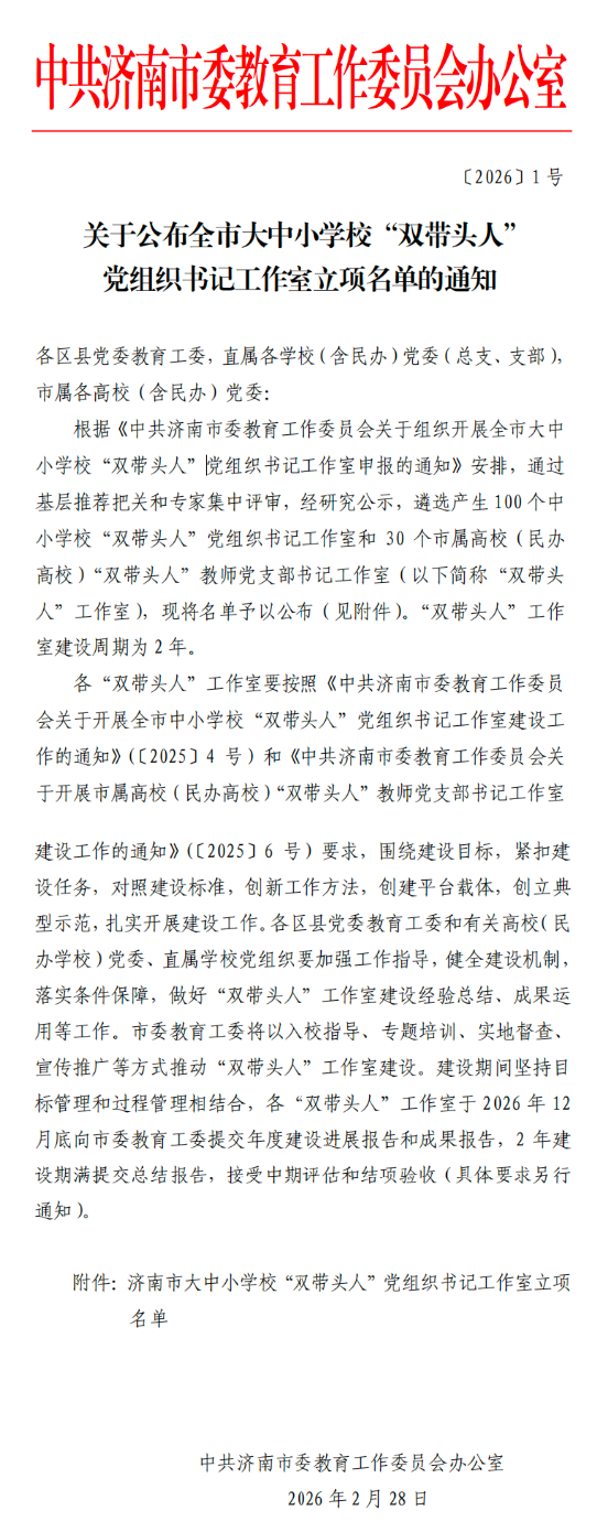近日,中共济南市委教育工作委员会办公室印发了《关于公布全市大中小学校“双带头人” 党组织书记工作室立项名单的通知》,此次拟立项名单中,历下区共有7所学校入选全市中小学校“双带头人”党组织书记工作室建设项目。