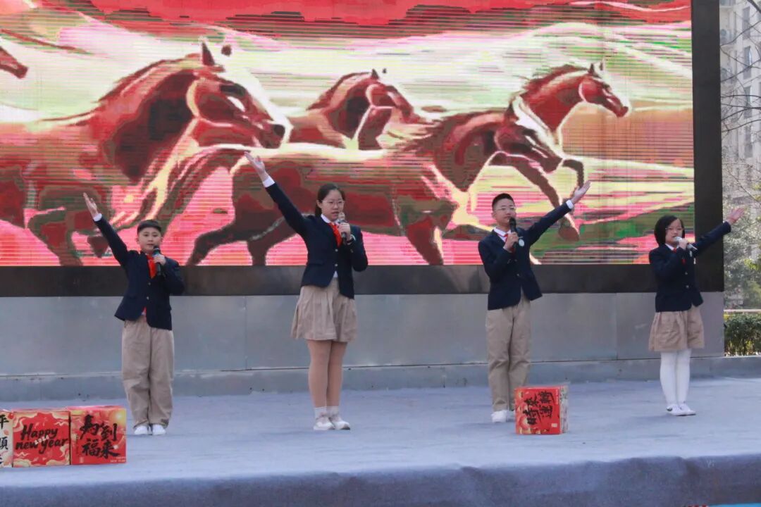 六(4)中队队员化身灵动“小骏马”,带来舞蹈《快乐小马》。队员们身着贴合主题的服装,伴随着轻快旋律,以整齐灵动的舞姿、饱满昂扬的热情,将青春活力与马年朝气完美融合,点燃现场氛围,传递出向阳生长的美好期许。