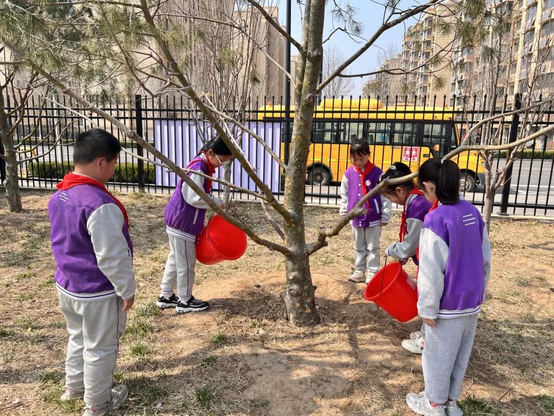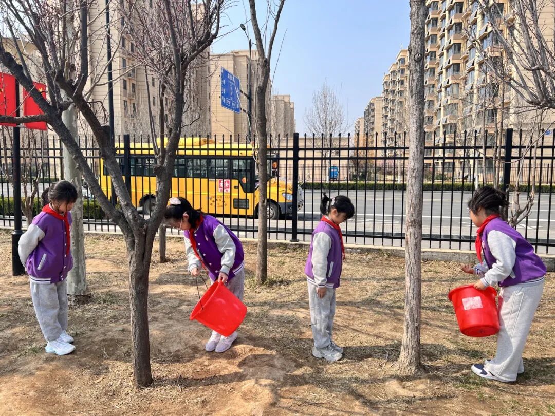为进一步美化校园环境,培养学生爱护植物、热爱劳动的良好品质,主题班会后,该班开展校园绿植集中浇水养护实践活动。活动现场,同学们手持小水桶,两两一组、分工明确,有序前往校园绿化带和树木旁。大家细心观察土壤干湿情况,弯腰缓缓浇水,动作轻柔谨慎,生怕水流过大冲倒幼苗、溅湿花草,眼神里满是对绿植的呵护与珍惜。低年级学生虽个子不高、力气不大,却也积极参与,认真为身边的小树小草浇水,用稚嫩的双手守护校园绿意。