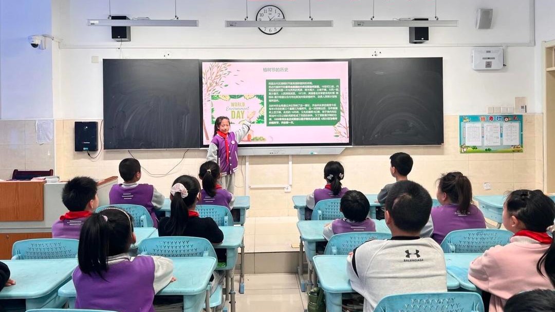 为让学生深刻理解植树节的由来与意义,树立尊重自然、保护自然的生态观念,三(6)班召开“植绿护绿,从我做起”主题班会。班会现场,班主任宋明月通过PPT演示、短视频播放、知识问答、故事分享等形式,向学生普及植树节历史背景,详细讲解树木在净化空气、保持水土、调节气候、美化环境等方面的重要作用。结合稼轩小学文化育人特色,宋明月倡导把绿色理念融入日常生活,引导学生以小见大,从爱护校园一草一木做起,争做生态文明的传播者、守护者和践行者。