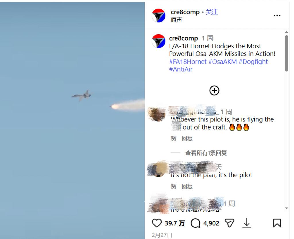 视频由一个名为“@cre8comp”的游戏内容创作者发布,配文写道:“F/A-18‘大黄蜂’战斗机躲避威力最强的Osa-AKM导弹实战画面!”