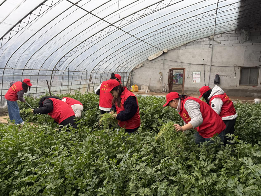 春日的暖阳透过蔬菜大棚的棚膜,照在济南高新东区蔬菜大棚内绿油油的田垄上。几位身穿红马甲的女职工正弯腰拔草、清理杂物。她们是“超英志愿者”的一员,趁着工作间隙赶来助农。种了一辈子地的农户老张在一旁指导:“对对,这种根深的得使劲拔,不然过两天又长出来了。”志愿者们应着声,手上的动作更加麻利。泥土沾上了鞋边,额头微微冒出汗珠,但看着身后逐渐整齐的菜地,大家的笑声在棚里回荡。