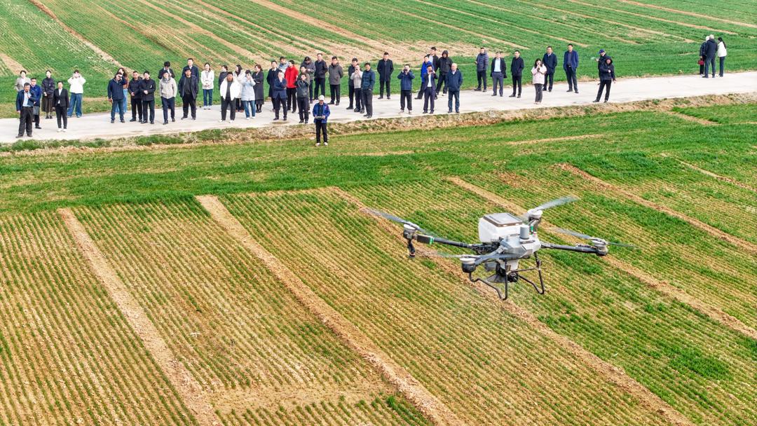 而在不远处返青的麦田上空,一架植保无人机正按照预设航线盘旋喷洒,15分钟便可完成一亩地的飞防作业。“以前人工打药效率低,人还得在地里走,难免接触农药。”青岛同富勤耕农业机械专业合作社理事长姜永战表示,“现在无人机不仅快,还能通过北斗系统自动规划最优路径,不重喷、不漏喷,安全又精准。”