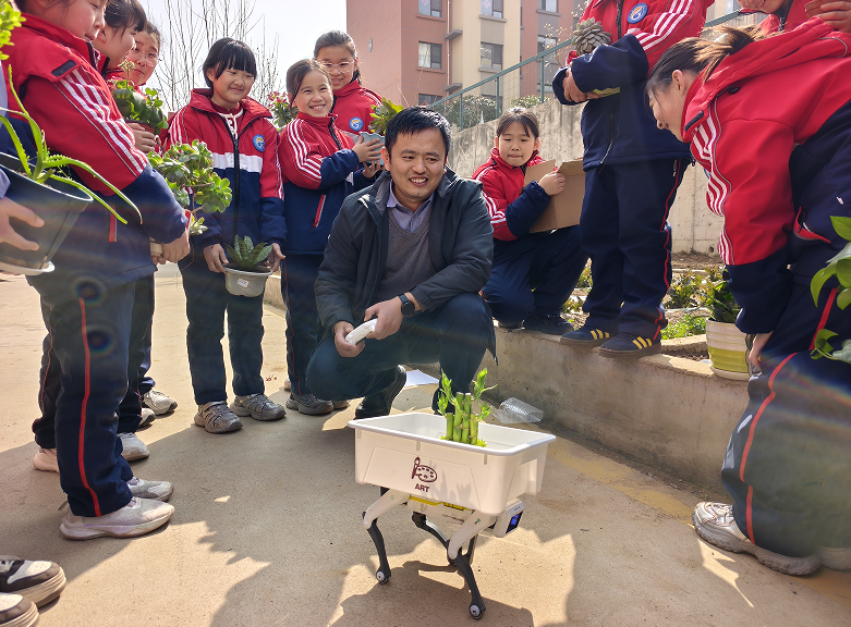 活动现场,智能狗化身“运输小助手”精准运送幼苗,科技辅导员开设户外科普课堂,生动讲解植物特性、智能设备原理等知识,通过趣味互动让抽象生态知识变得通俗易懂。核心种植区内,师生协作完成挖坑、扶苗、培土等流程,灵活运用智能技术护绿育苗,让每一株新苗都浸润科技力量。