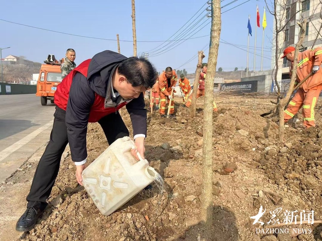 大家三人一组、五人一队,分工协作,配合默契。挥锹铲土、扶苗填坑、提水浇灌,每一个环节都做得一丝不苟。经过一上午的奋战,百余株适宜本地生长的乡土树苗在园区道路两旁“安家落户”,迎风挺立,生机勃勃,为初春的产业园区增添了一道靓丽的风景线。