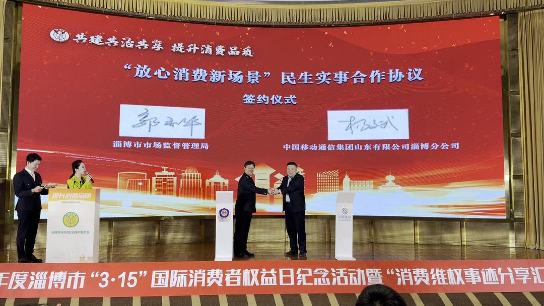 活动现场,山东移动淄博分公司党委书记、总经理杨斌代表淄博移动介绍2025年度“电梯无线网络信号全覆盖 提升消费者满意度”民生实事合作成效并围绕2026年“提升消费品质”主题发布倡议。淄博市市场监管局、山东移动淄博分公司签订“放心消费新场景”民生实事合作协议。