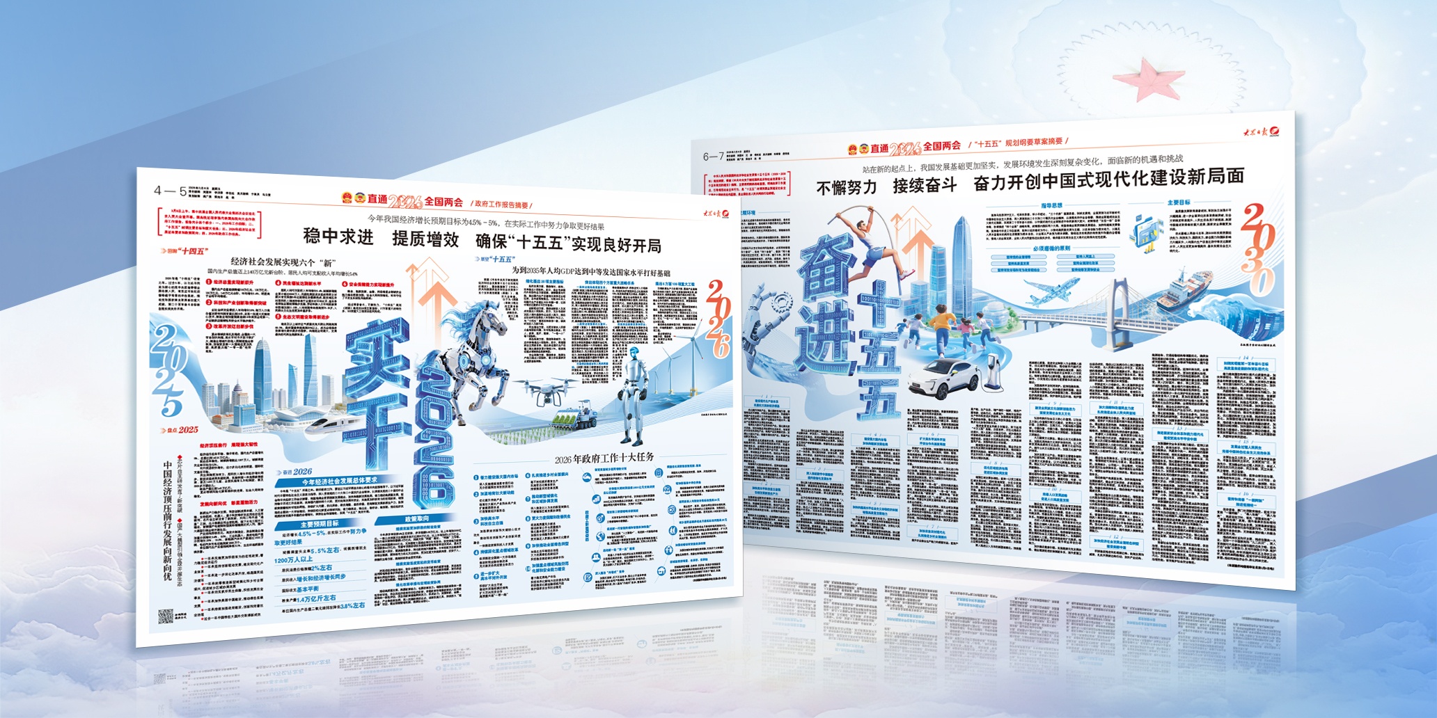 双通版创意“解码”,照见中国未来。按照“实干2026”“奋进‘十五五’”两大板块,创意解码政府工作报告和“十五五”规划纲要草案,一图读懂里照见中国新蓝图。策划推出“新蓝图·问策‘十五五’”专版,《供需适配,让内需主引擎更强劲》《向新向优向智,建强现代化产业体系》《用“关键一招”打开高质量发展新天地》等专题报道,直面扩内需促消费、建强现代化产业体系、能源绿色转型等焦点,报告深读,权威解码中国经济新动向。