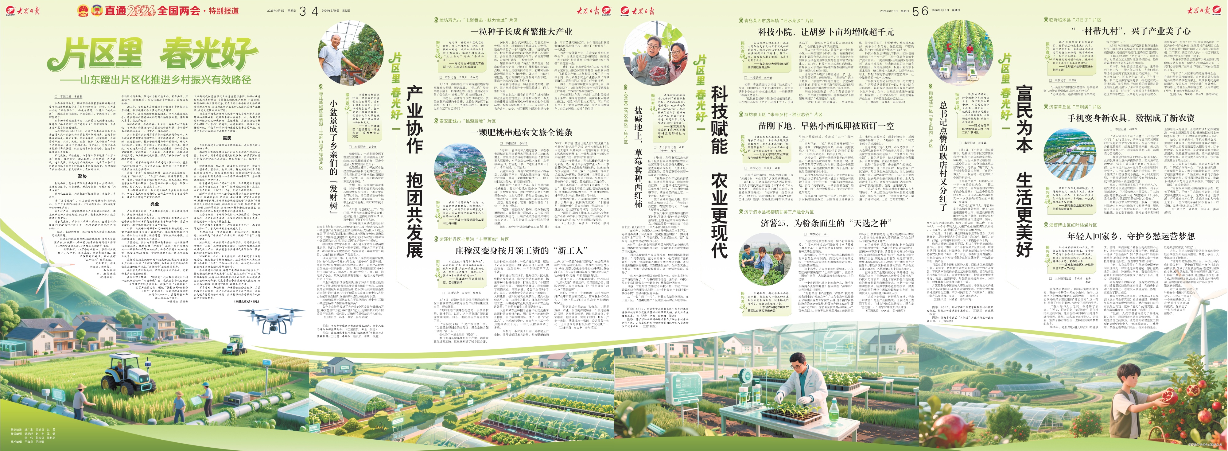 3月8日,紧扣八年前总书记“打造乡村振兴的齐鲁样板”重要指示,策划推出“片区里 春光好”4连版特别报道,让百姓讲故事,用AI绘长卷,连版成图,铺陈一幅生机盎然的乡村振兴新画卷。