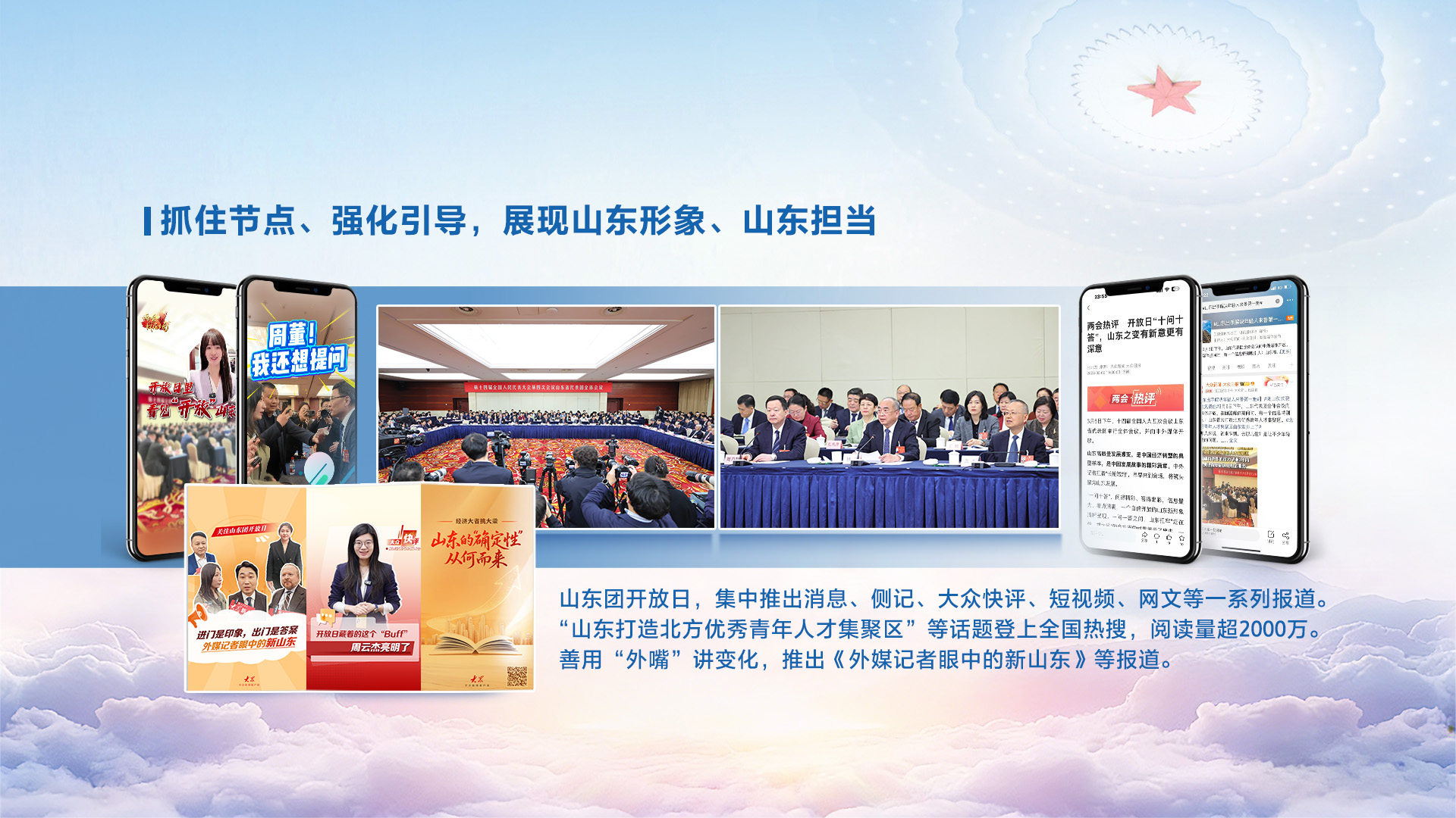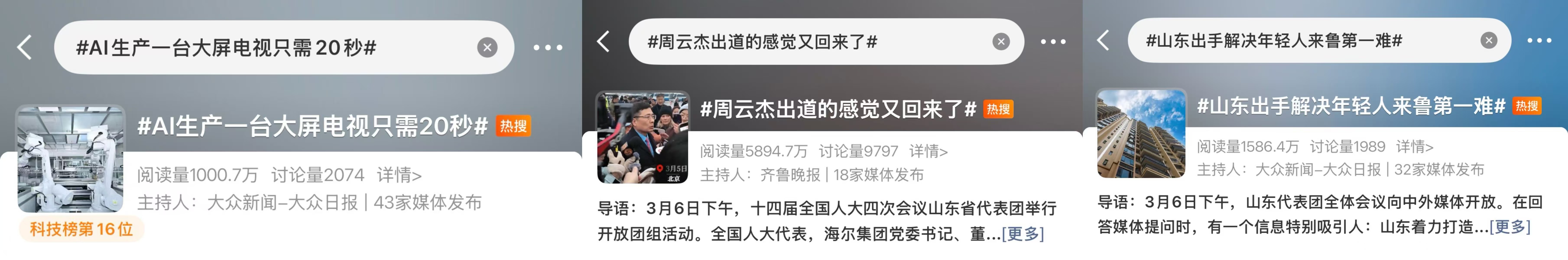山东团开放日历来是两会报道的重头戏。大众报业集团融合消息、侧记、快评、短视频、网文等多元形态,推出系列鲜活报道。《山东省代表团全体会议向中外媒体开放》《优秀青年来鲁“第一站”:免费住!优惠租!帮着买!》《周云杰现场邀请韩国记者去青岛》等产品,通过现场回眸、细节再现等方式,带领受众“身临其境”,真切感受山东的开放胸襟。集团媒体商业号矩阵同频发力,#周云杰出道的感觉又回来了#(阅读量5894.7万)、#山东出手解决年轻人来鲁第一难#(阅读量1513万)等话题登上微博全国热搜,#山东打造北方优秀青年人才集聚区#登上快手全国热榜。