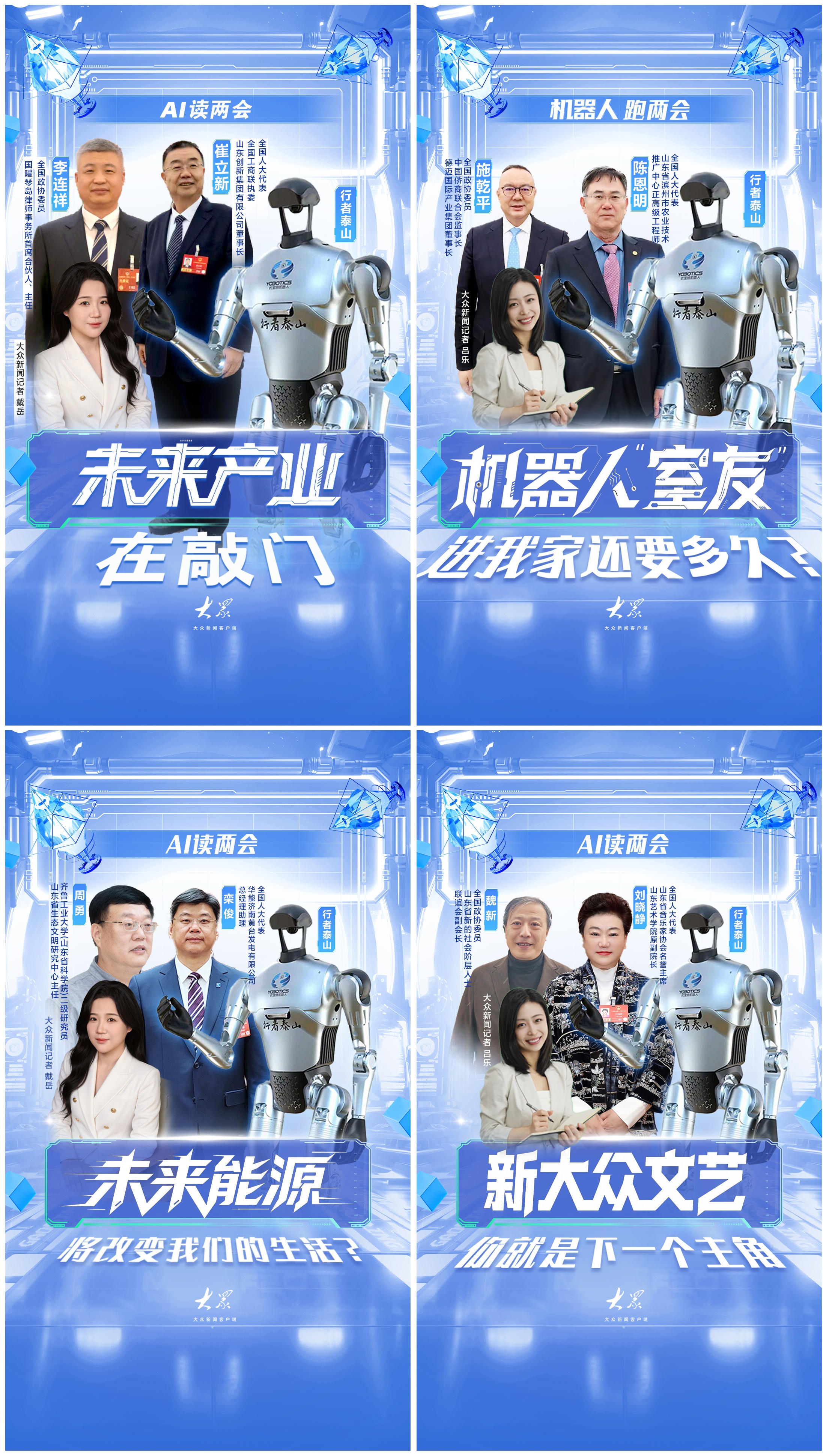 AI技术赋能,开启人机协作、云端对话新尝试。大众日报·大众新闻启用“行者泰山”“小珞”两款智能机器人担任特约记者,结合AI大模型推出《AI读两会》栏目,设置机器人与代表委员“云对话”特色环节,《AI读两会|未来产业在敲门》《AI读两会丨新大众文艺 你就是下一个主角》等产品,让热点话题实现轻量化表达和沉浸式互动。