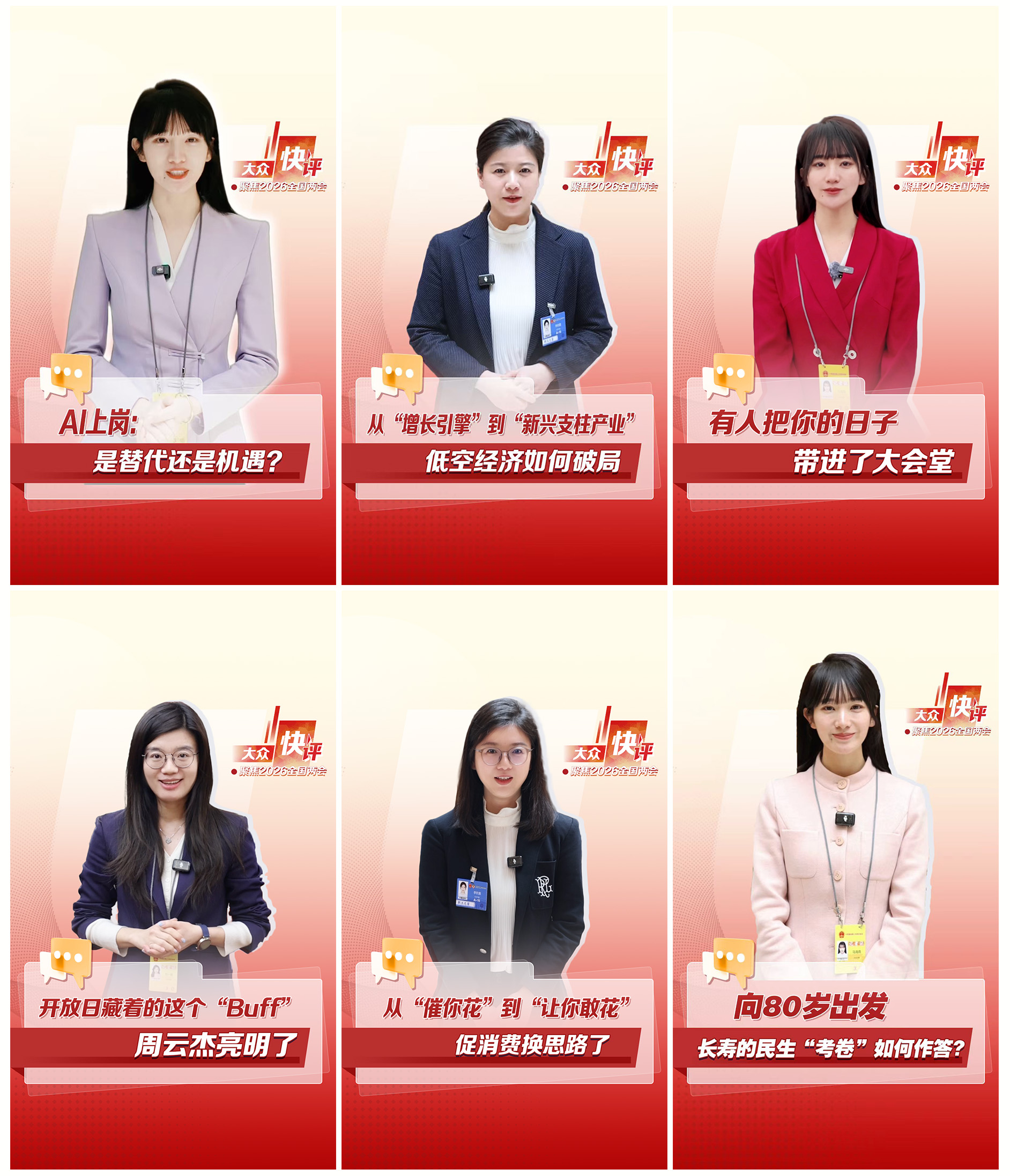 “大众快评·两会特辑”则围绕热点话题精准拆解,以轻量化、快节奏的短视频评论强势破局,《开放日藏着的这个“Buff”,周云杰亮明了》《有人把你的日子带进了大会堂》《向80岁出发,长寿的民生“考卷”如何作答?》等产品切口小而巧、表达新而活,让主流声音以更轻盈的方式抵达年轻受众,引发广泛转发与讨论。