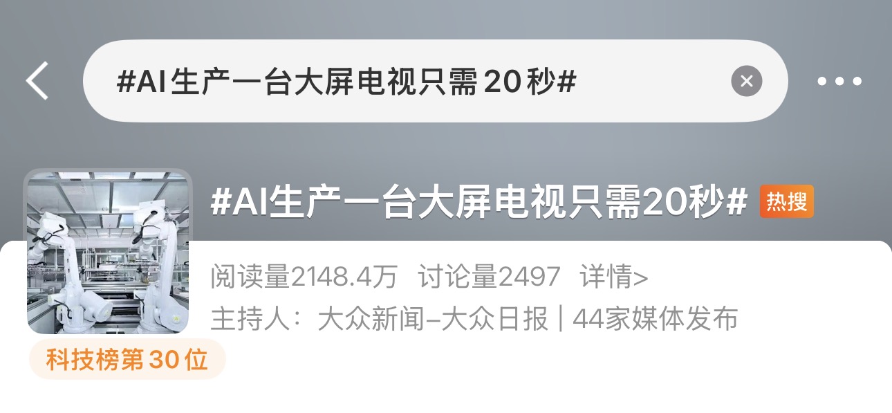聚焦“代表通道”山东力量,解码中国智造背后的企业信心。全国人大代表贾少谦亮相代表通道,大众日报·大众新闻第一时间推出《用AI把客户需求写进生产线里》《代表通道|贾少谦:三个数字见证中国制造走向中国“智”造》《AI是中国制造向智造转变的巨大机遇》等现场报道,透过镜头前的关键数字和鲜活讲述,展现新质生产力浪潮下中国企业家的时代思考与发展信心。话题#AI生产一台大屏电视只需20秒#阅读量达2148.4万,登上微博全国热搜。