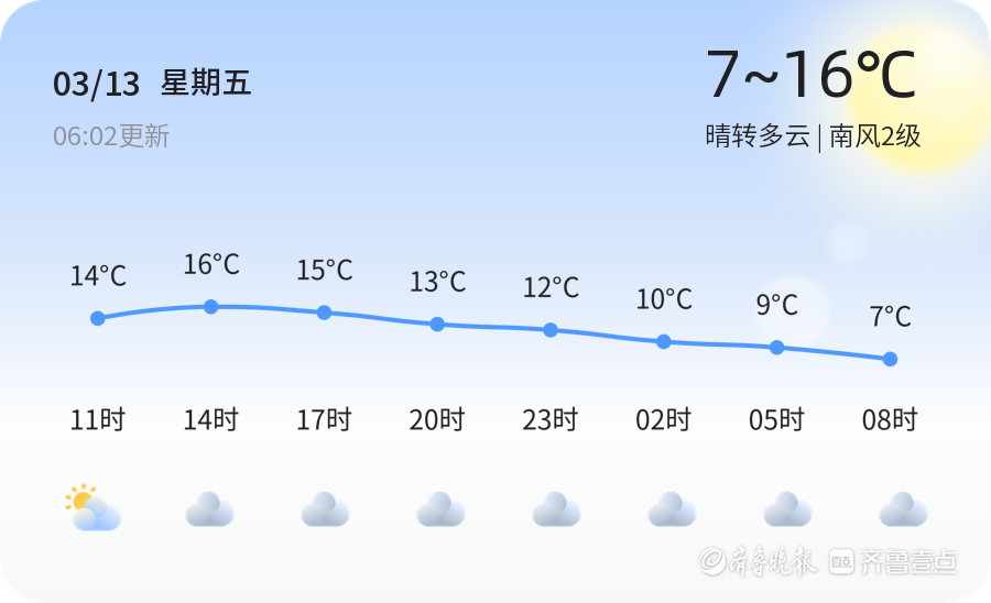 东营市今日天气晴转多云,气温7℃至16℃,空气质量良好