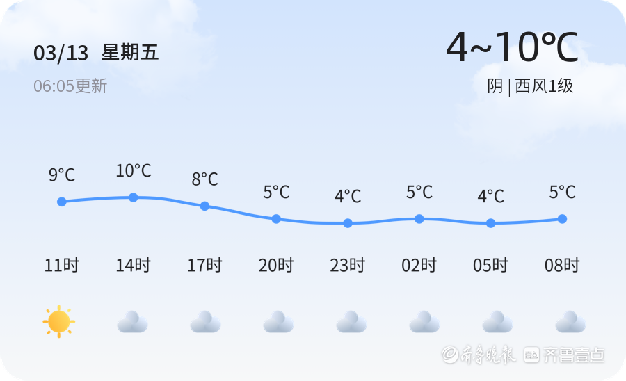 今天是3月13日,星期五,农历正月廿五。威海市今日天气阴沉,气温在4℃至10℃之间,西风1级,空气湿度为42%。当前空气质量良好,PM2.5浓度为80微克/立方米,属于良好水平。今日阴天,光照不足,建议市民出行时携带雨具,注意交通安全。