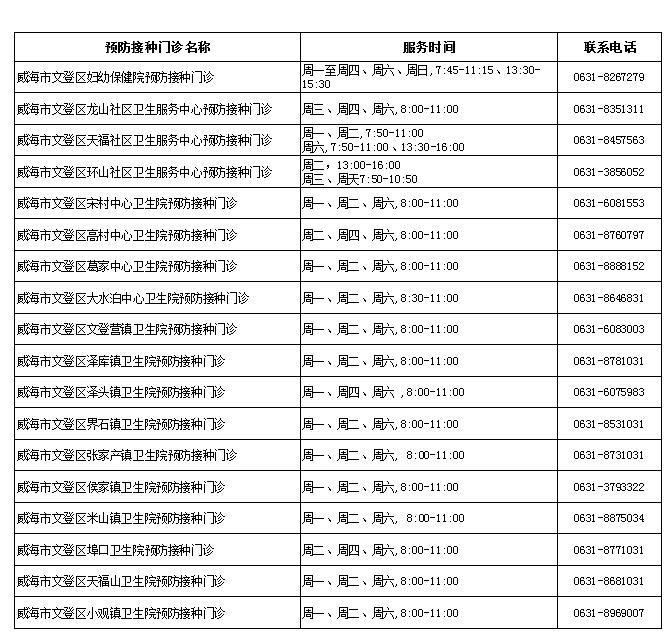 目前文登区常规预防接种门诊均已开展带状疱疹疫苗预约工作,可查看下图查找就近的常规预防接种门诊电话和地址。具体接种时间将依据门诊的服务时间及实际工作情况确定。