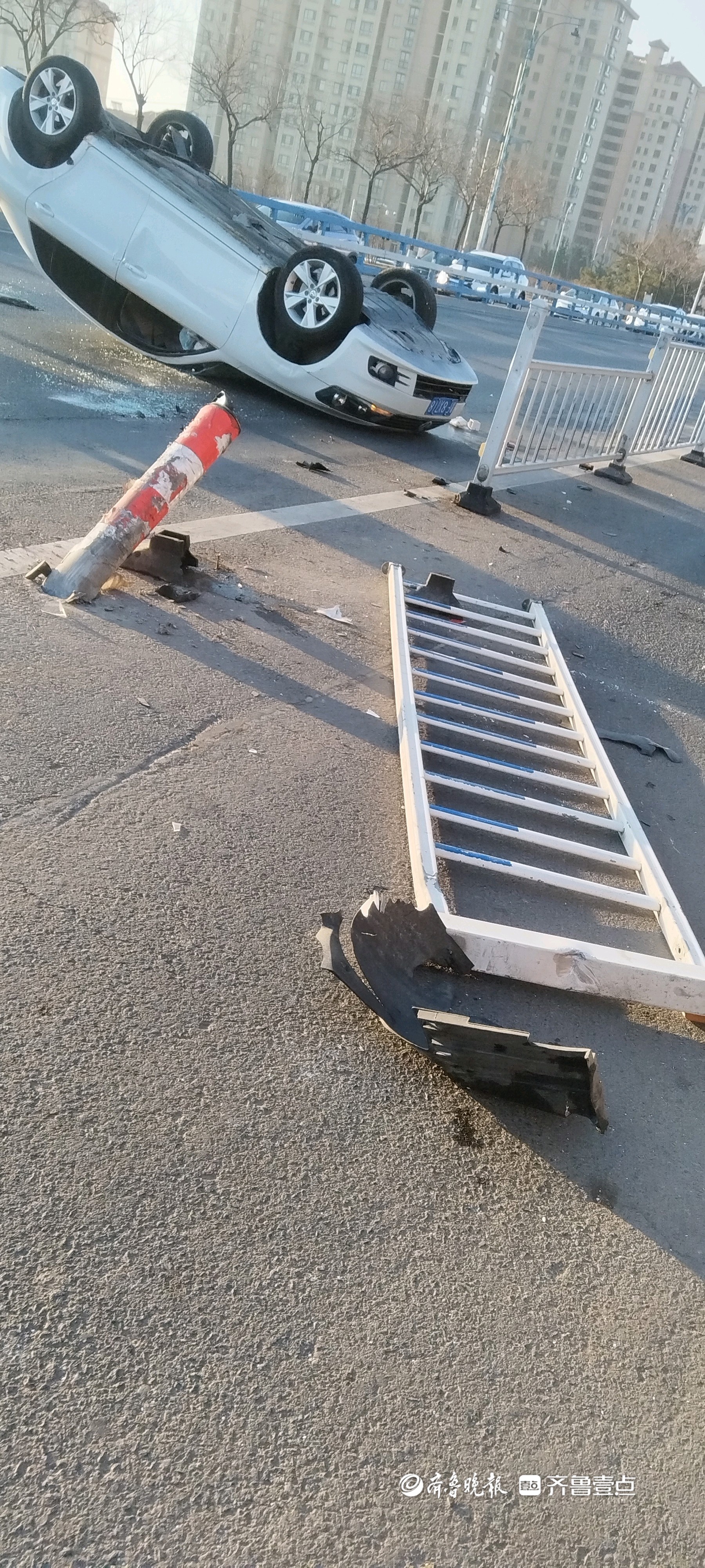 情报站|烟台奇泉路发生交通事故,一辆轿车四脚朝天躺在地上