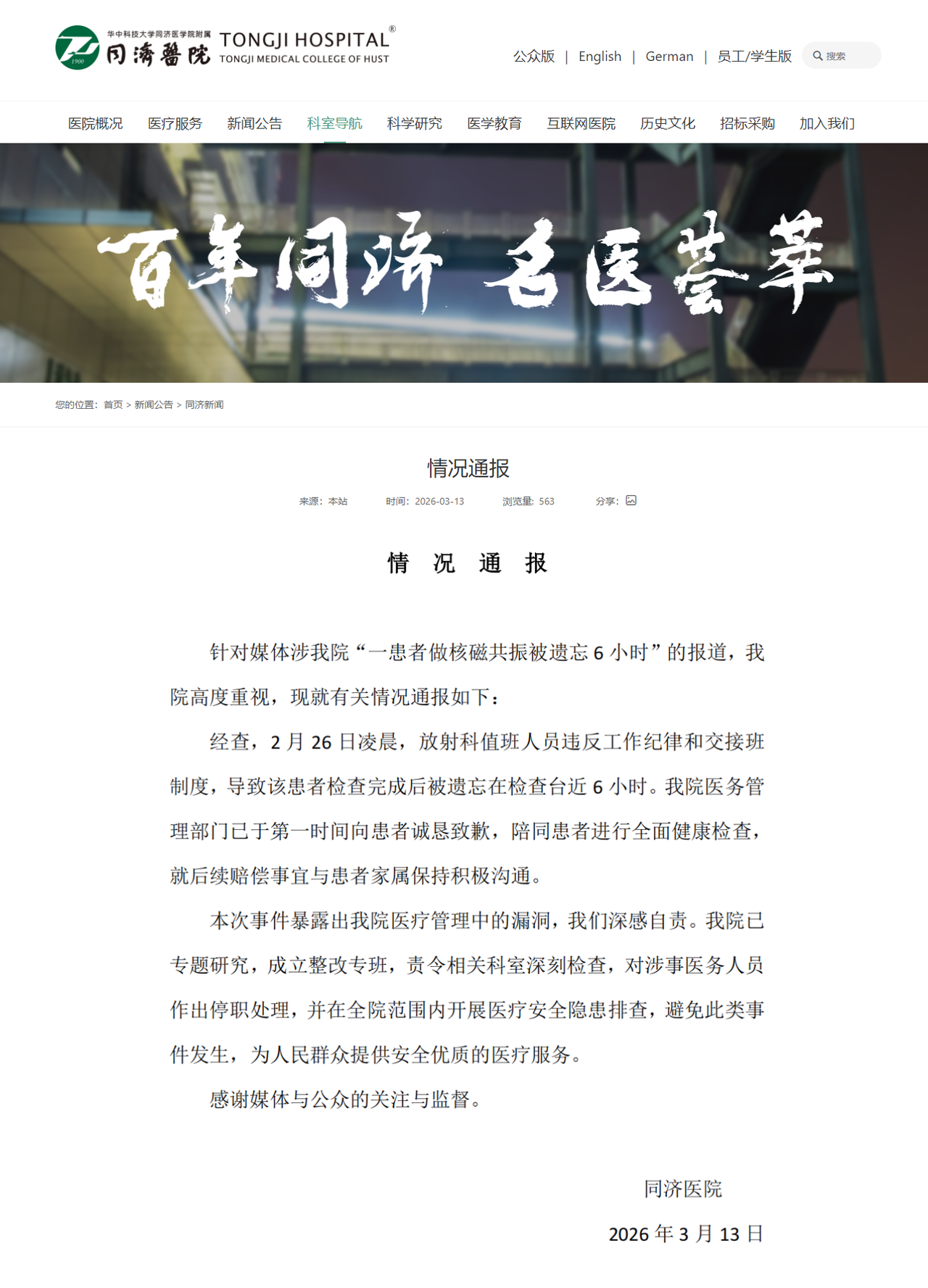 华中科技大学同济医学院附属同济医院3月13日发布情况通报: