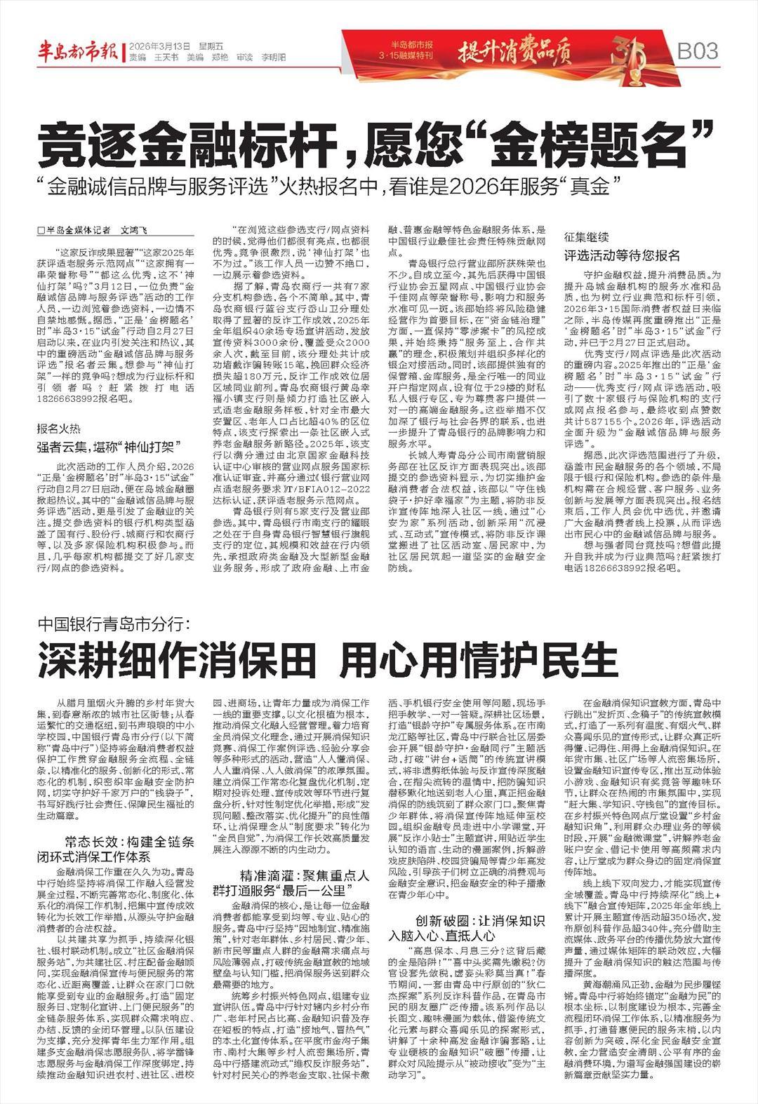 从腊月里烟火升腾的乡村年货大集,到春意渐浓的城市社区街巷;从春运繁忙的交通枢纽,到书声琅琅的中小学校园,中国银行青岛市简称“青岛中行”)坚持将金融消费者权益保护工作贯穿金融服务全流程、全链条,以精准化的服务、创新化的形式、常态化的机制,织密织牢金融安全防护网,切实守护好千家万户的“钱袋子”,书写好践行社会责任、保障民生福祉的生动篇章。