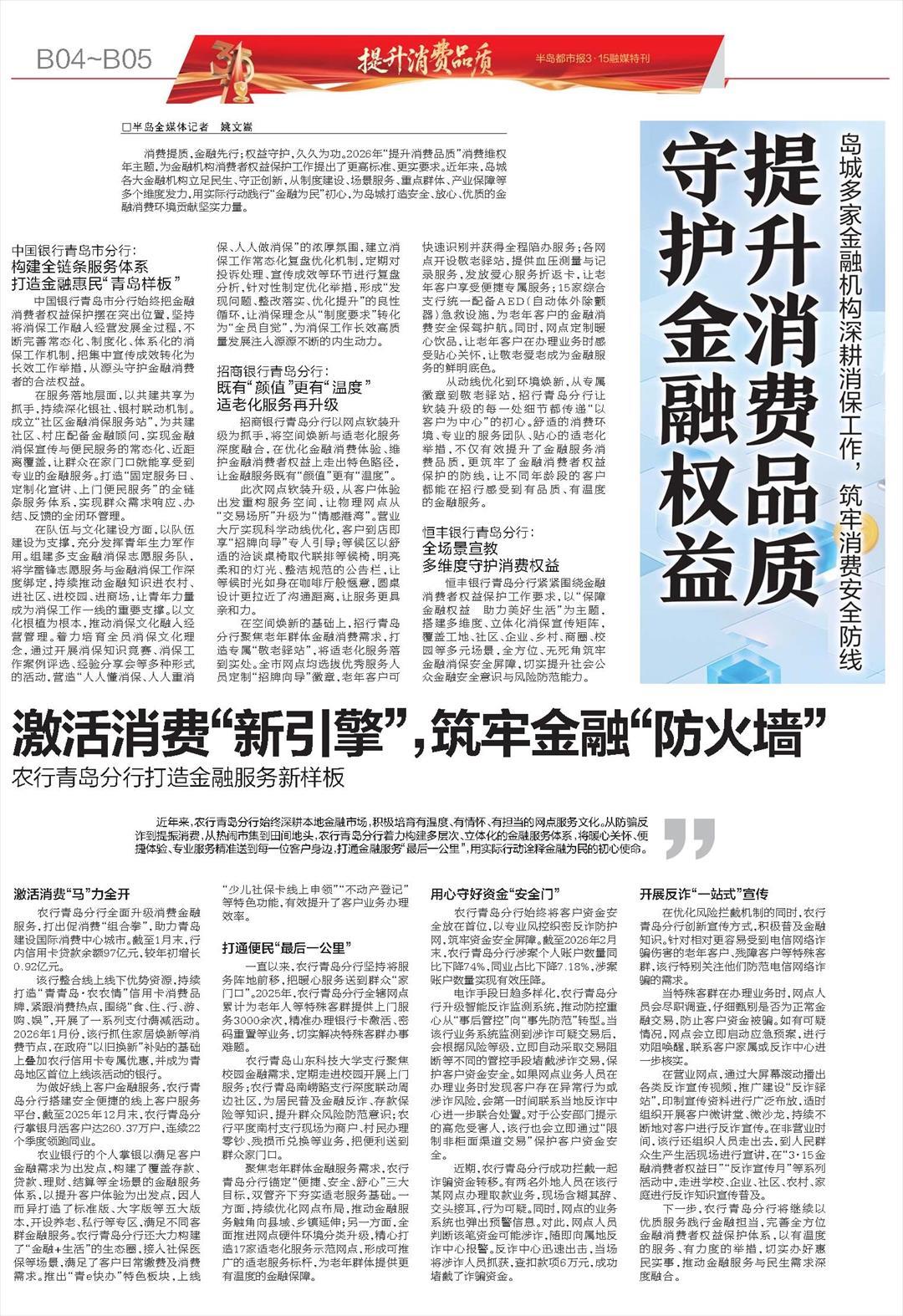 消费提质,金融先行;权益守护,久久为功。2026年“提升消费品质”消费维权年主题,为金融机构消费者权益保护工作提出了更高标准、更实要求。近年来,岛城各大金融机构立足民生、守正创新,从制度建设、场景服务、重点群体、产业保障等多个维度发力,用实际行动践行“金融为民”初心,为岛城打造安全、放心、优质的金融消费环境贡献坚实力量。