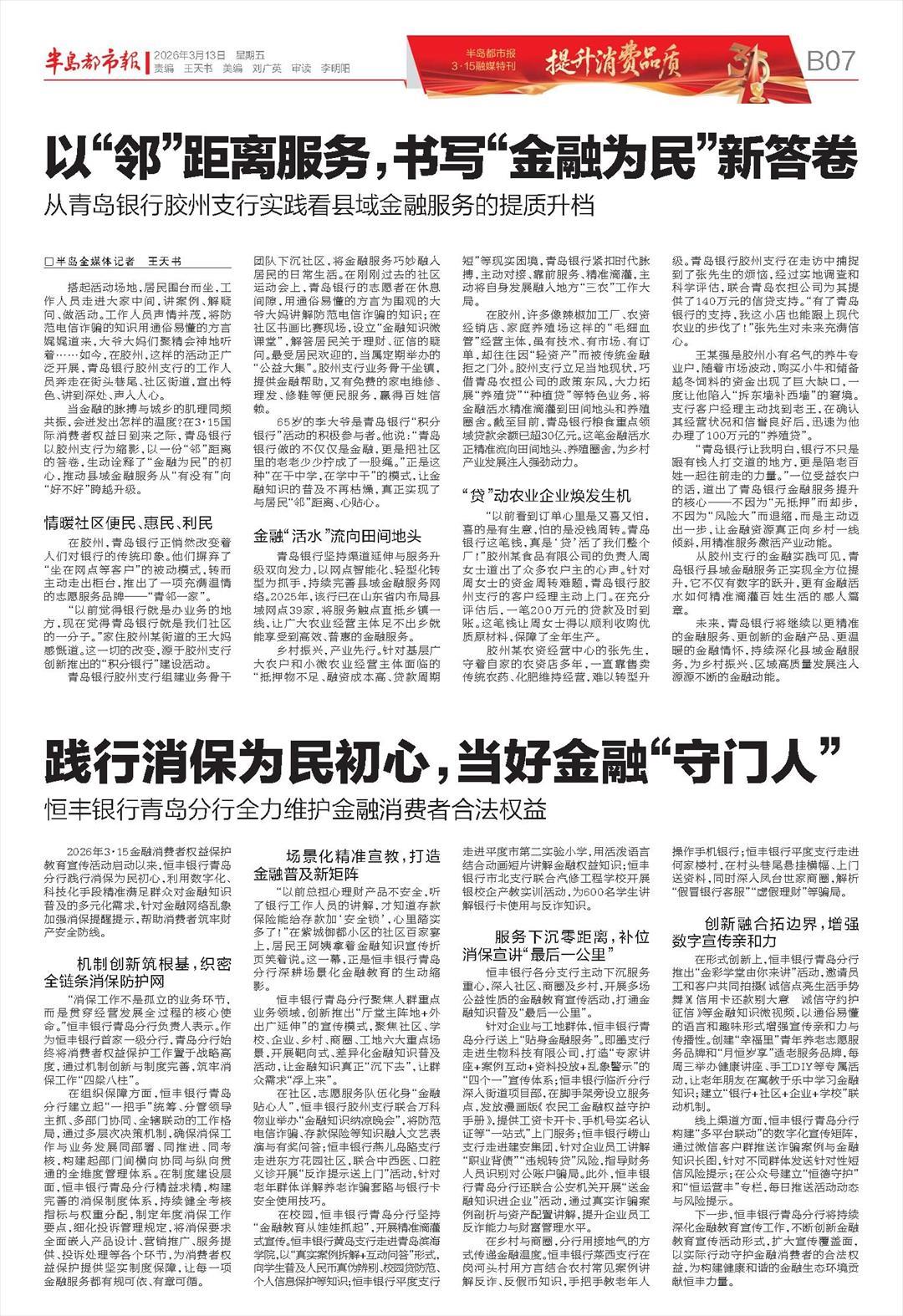 当金融的脉搏与城乡的肌理同频共振,会迸发出怎样的温度?在3·15国际消费者权益日到来之际,青岛银行以胶州支行为缩影,以一份“邻”距离的答卷,生动诠释了“金融为民”的初心,推动县域金融服务从“有没有”向“好不好”跨越升级。
