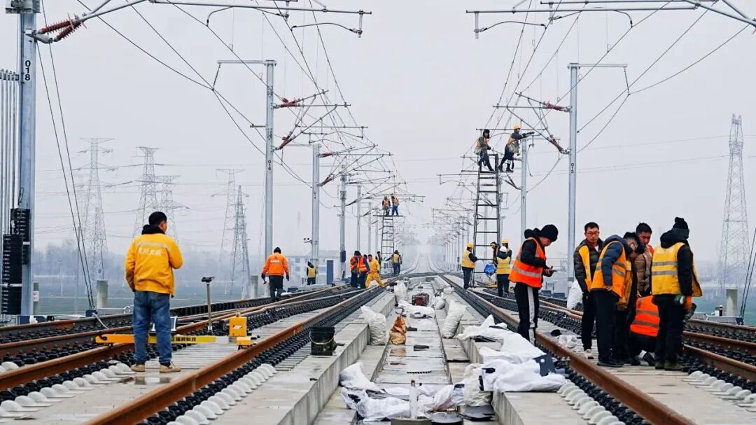 目前,国铁济南局工务、电务、供电等多个专业工种协同作业,开展静态验收、接触网设备检查、钢轨探伤及轨道精调精修、道岔杆件安装精调等工作。