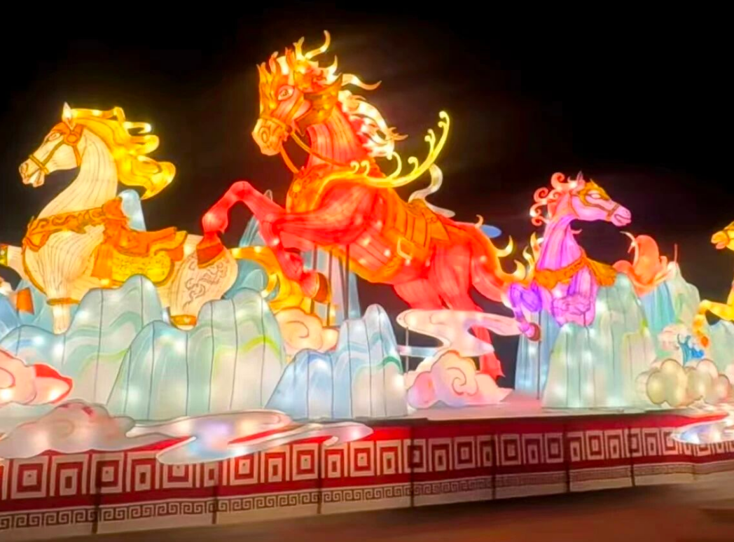 这不仅是彩灯技艺的单向输出,更是一场跨越地域的文化对话。120名工匠历时45天,在16万平方米的湖面上编织出50余组灯组,将“形、色、声、光、动”的艺术特色与济宁本土文化深度融合。《运河之都》灯组以动态光影复刻漕运盛景,货船穿梭、纤夫号子仿佛将观众带回“运河之都”的繁华岁月;《骏马奔腾》则以流线型灯组勾勒万马驰骋之势,既呼应马年主题,又暗合济宁作为古代交通枢纽的商贸记忆。