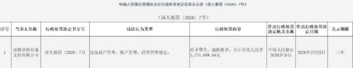 近日,中国人民银行深圳市分行行政处罚信息公开表显示,深圳市快付通支付有限公司因违反商户管理、账户管理、清算管理规定,被警告、通报批评,合计罚没人民币1271069.14元。