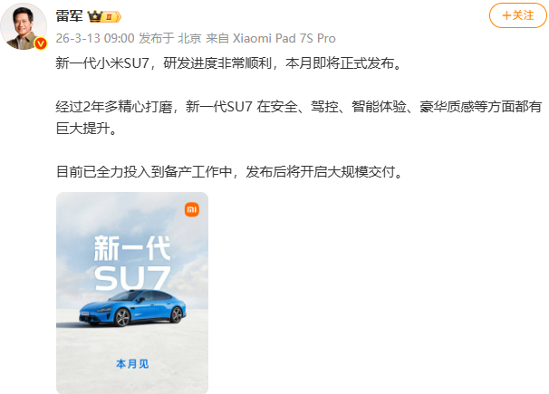 3月13日,雷军发布微博:新一代小米SU7,研发进度非常顺利,本月即将正式发布。经过2年多精心打磨,新一代SU7 在安全、驾控、智能体验、豪华质感等方面都有巨大提升。目前已全力投入到备产工作中,发布后将开启大规模交付。
