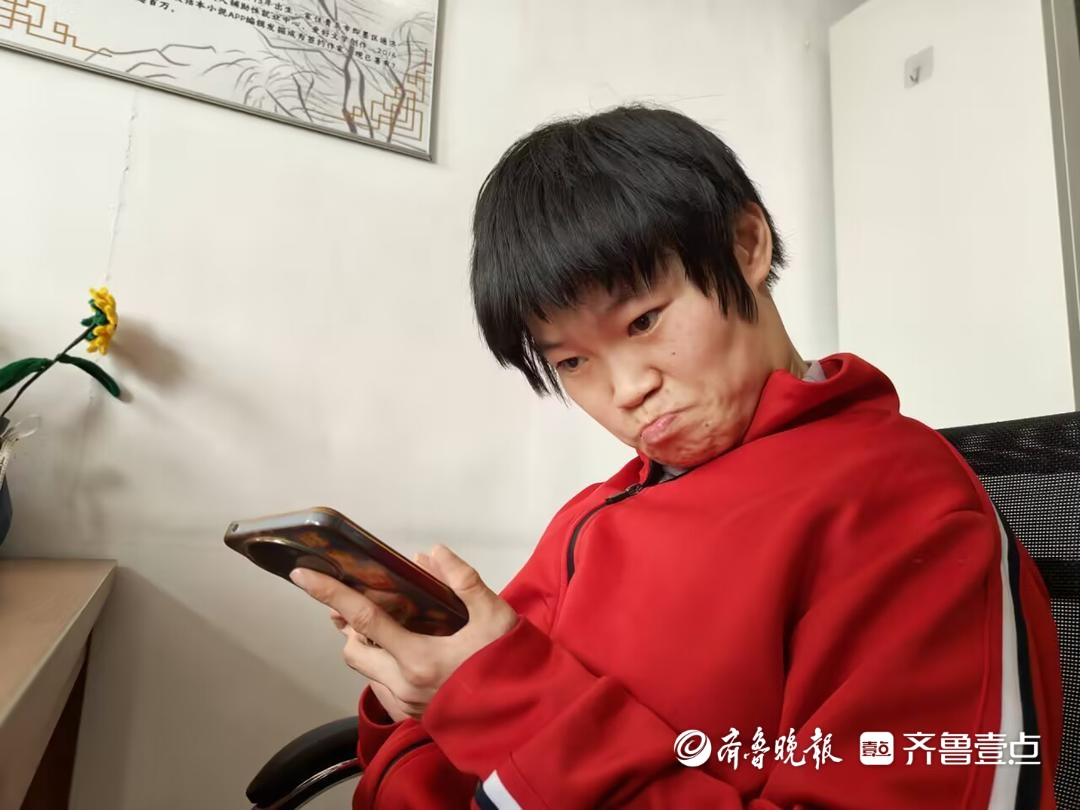 3月12日上午,青岛市即墨区祥泰残疾人综合服务中心,一间十几平米的安静屋子里,姜吉翔正坐在桌前,身体微微向右倾斜,头不自觉地歪着。她低着头,目光紧紧锁定在手中的手机屏幕上,右手手指颤抖着,努力对准屏幕上的每一个字母。