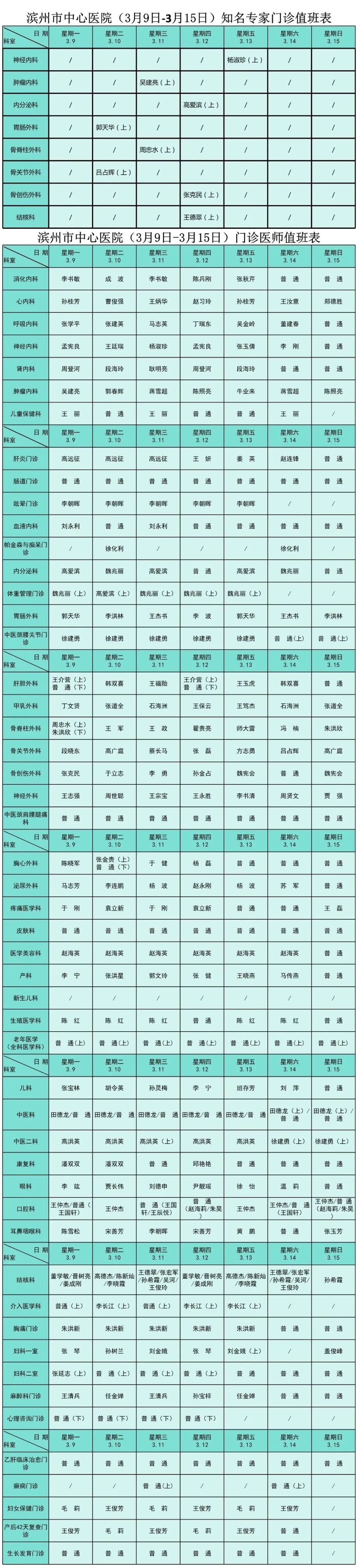收藏丨滨州市中心医院2026年3月9日—15日门诊医师值班表