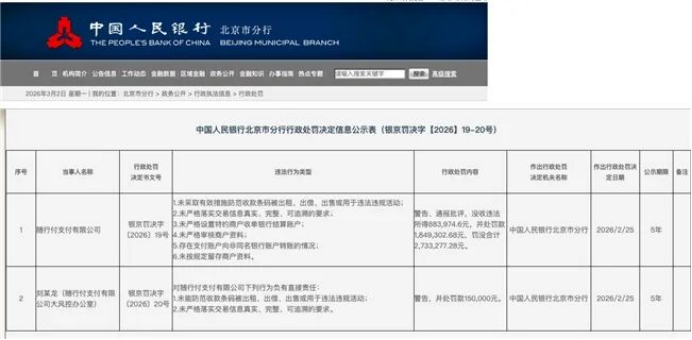 2月28日,中国人民银行北京市分行发布行政处罚决定信息公示表显示,随行付支付有限公司(下称“随行付”)因多项违法行为,被警告、通报批评,没收违法所得88.40万元,并处罚款184.93万元,罚没合计273.33万元。