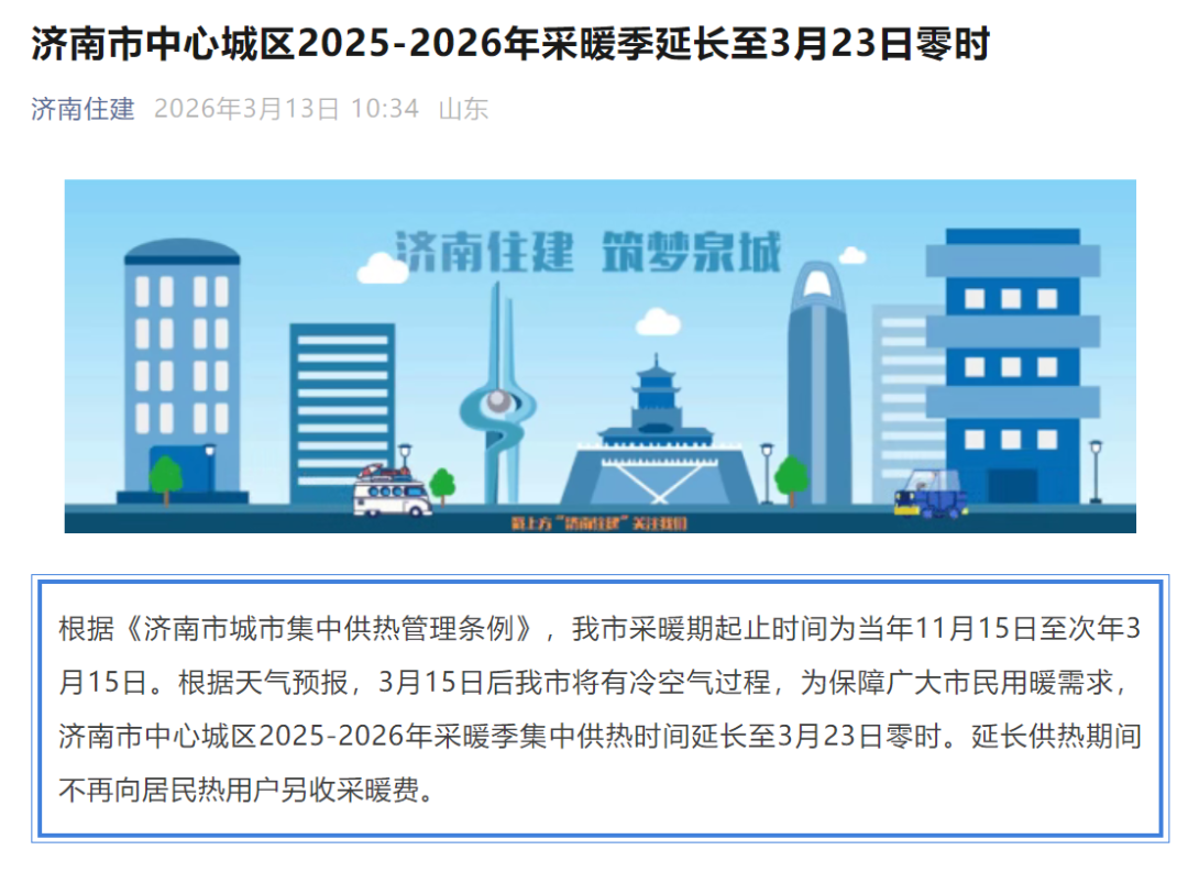 根据《济南市城市集中供热管理条例》,济南市采暖期起止时间为当年11月15日至次年3月15日。根据天气预报,3月15日后济南市将有冷空气过程,为保障广大市民用暖需求,济南市中心城区2025-2026年采暖季集中供热时间延长至3月23日零时。延长供热期间不再向居民热用户另收采暖费。