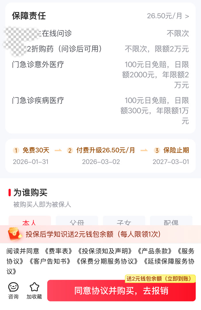 例如,记者随机进入某购物平台,其保险专区即弹出“门诊险”推荐,右下方出现“同意协议并购买,去报销,送2元钱包余额”的醒目红框。而点击的同时,即相当于对红框周边以极小字体排列出的“产品条款”“客户告知书”等七项协议表示知情同意。不但如此,使用者也很难注意到页面中还有,接下来一年内“前30天免费”,随后“升级为26.5元/月”的信息,且延续保障服务也默认勾选为“立即开通”。用户很可能以为就是领了个红包,意识不到已经完成了投保。