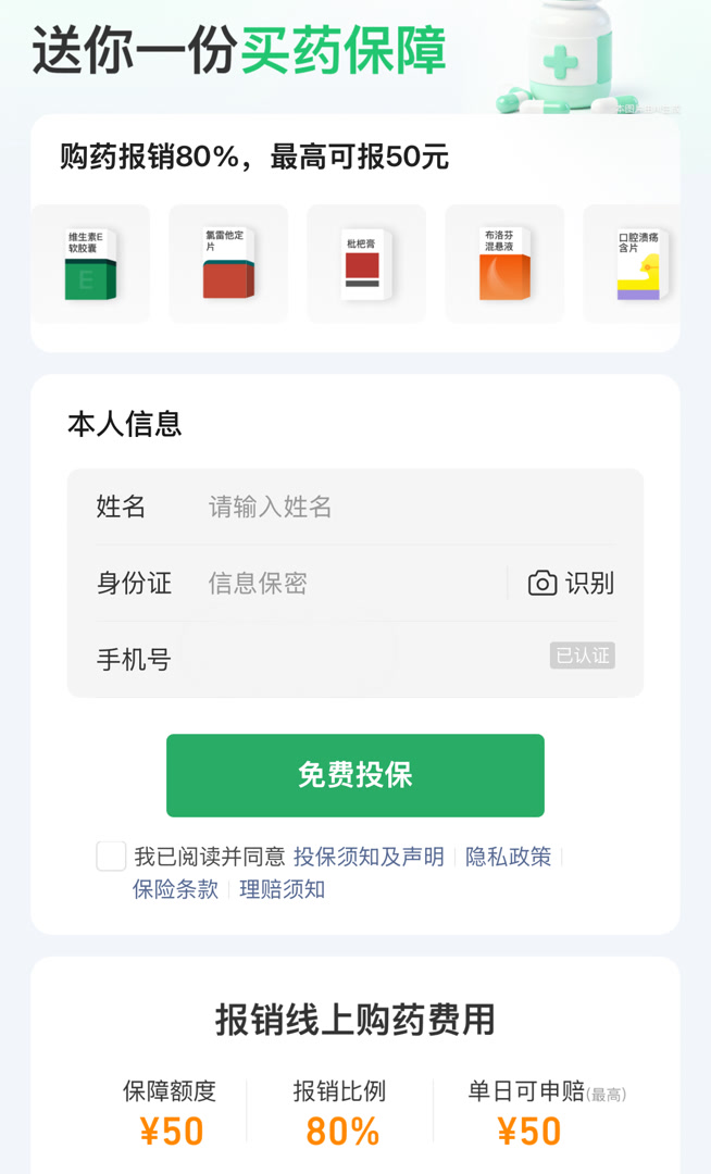 然而在个人信息下方,则有一个“免费投保”的按钮,显示其本质依然是一种保险。后面则以更细小的浅色字样标出投保须知及声明、保险条款、免责声明等近十项条款,只要在“我已阅读并同意”的框内打钩,这些条款即全部视作知情同意。