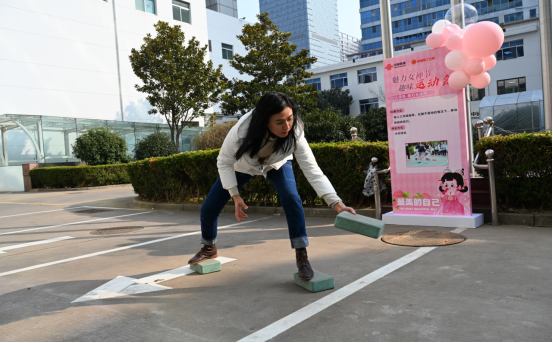 在“摸石头过河”赛道旁,市场部的李姐正为队友呐喊。数字化部的郭主任是第一次参加,她双脚踩着泡沫板,像踩在河中的踏脚石般交替向前,既要保持平衡,又要比拼速度。“平时敲键盘手速快,没想到脚下功夫也得练!”