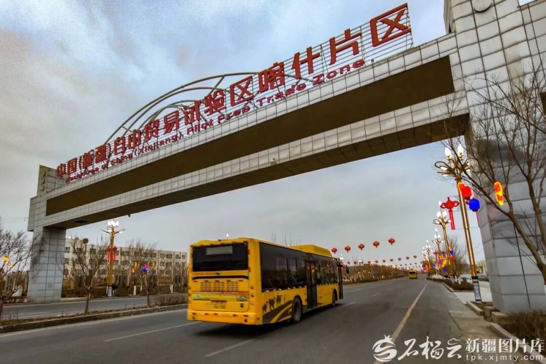 2月6日,一辆巴士从中国(新疆)自由贸易试验区喀什片区欧亚大道上驶过(资料图片)。