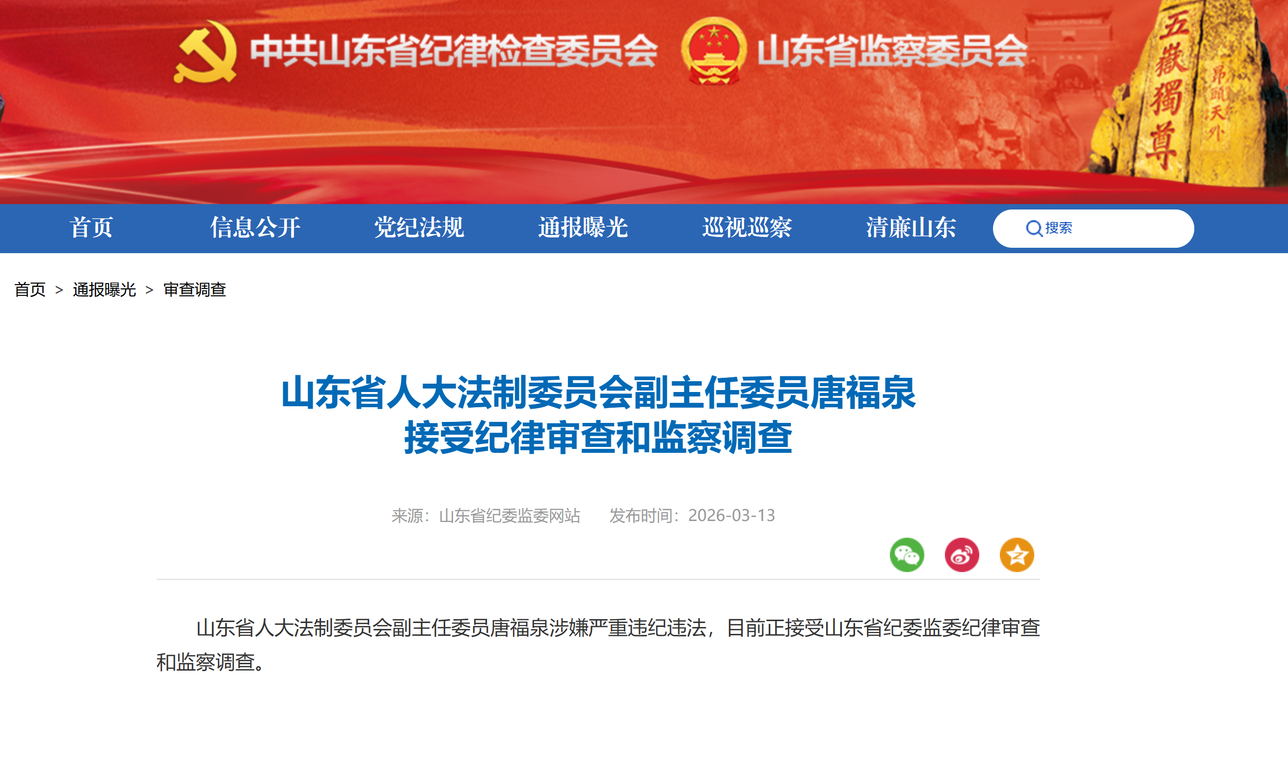 山东省纪委监委网站3月13日消息,山东省人大法制委员会副主任委员唐福泉涉嫌严重违纪违法,目前正接受山东省纪委监委纪律审查和监察调查。