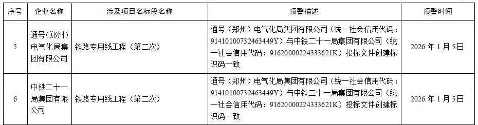 内容显示,中铁二十一局、通号电气化局所涉及项目均是“铁路专用线工程(第二次)”,其预警描述均显示二者的“投标文件创建标识码一致”,预警时间同为1月5日。
