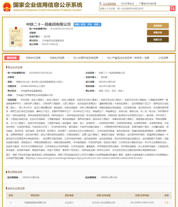 国家企业信用信息公示系统显示,中铁二十一局集团有限公司成立于2001年,注册资本203800万元人民币,法定代表人为庄纪栋,由中国铁建(601186.SH/01186.HK)全资持股。