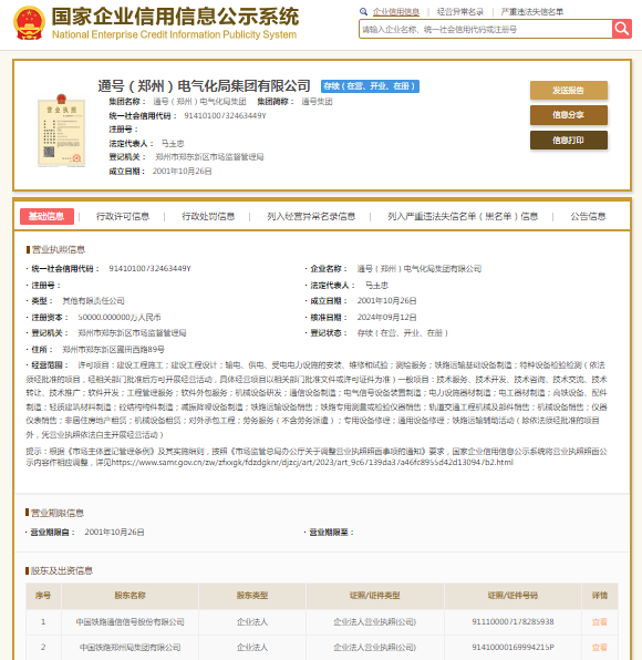 通号(郑州)电气化局集团有限公司成立于2001年,注册资本50000万元人民币,法定代表人为马玉忠,大股东为中国通号(688009.SH/03969.HK)。
