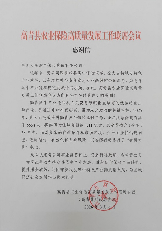 此次感谢信是地方政府对公司农险服务的充分认可,更是激励与鞭策。下一步,人保财险淄博高青支公司将持续深化与联席会议各成员单位的协同联动,不断优化黑牛保险产品供给、提升服务质效,以更扎实的举措守护高青黑牛特色产业高质量发展,为县域经济社会发展贡献更大的人保力量。