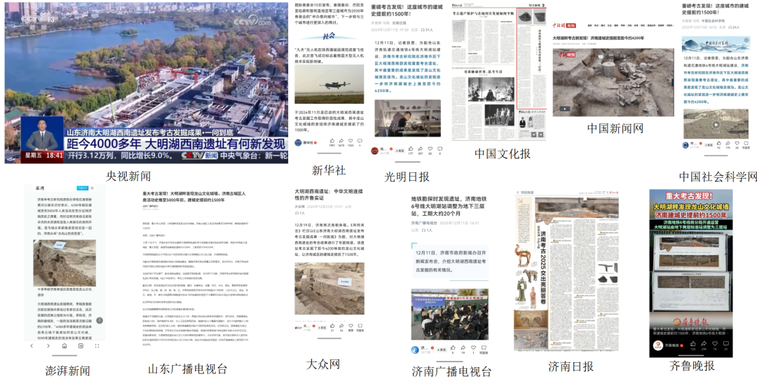 大明湖西南遗址的重大考古发现迅速引起了社会各方的广泛关注,新华社、光明日报、央视新闻、中国青年报等中央媒体和省、市主流媒体刊发新闻报道,特别是新华社新闻客户端、央视新闻客户端相关稿件浏览量均突破一百万次,央视《晚间新闻》《朝闻天下》《共同关注》等栏目进行了专题播报。“济南建城史提前至4200年前”等话题持续一周在今日头条济南榜位居前十名,考古成果升华为凝聚城市精神的文化事件,为济南文化事业的长远发展注入强劲、持久的动能。