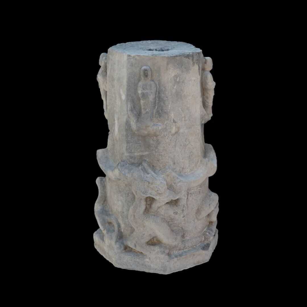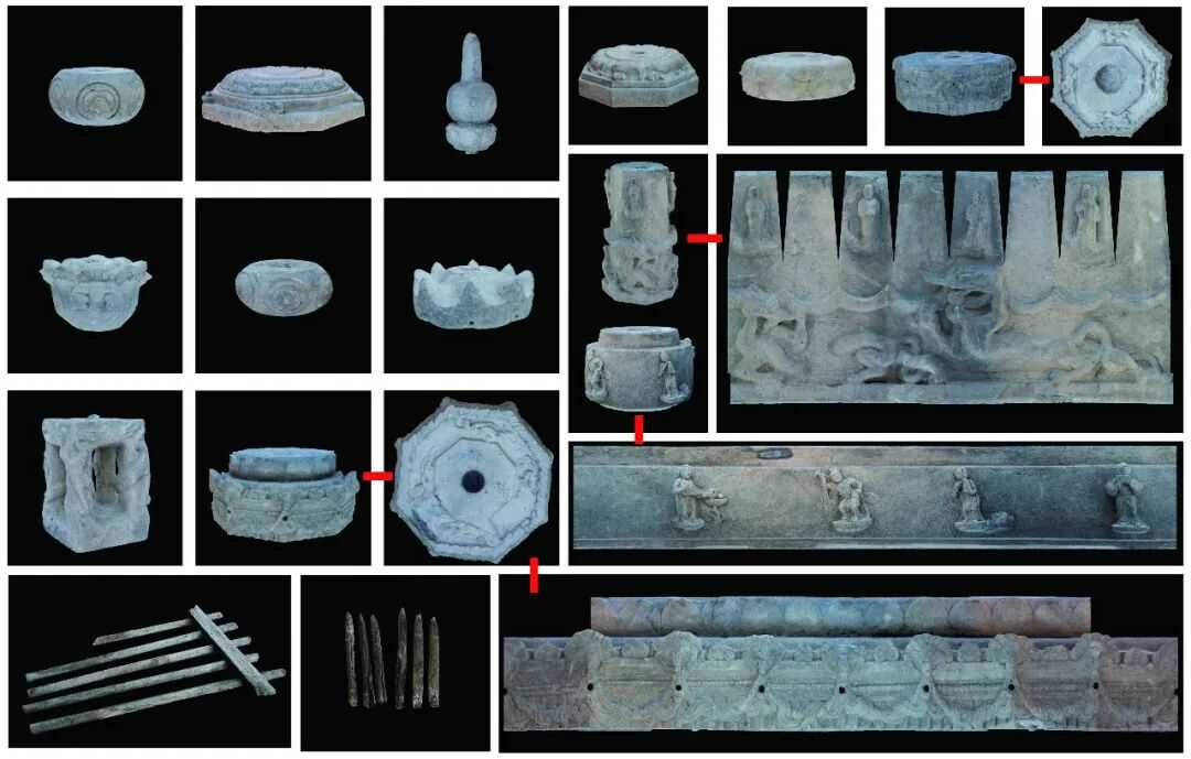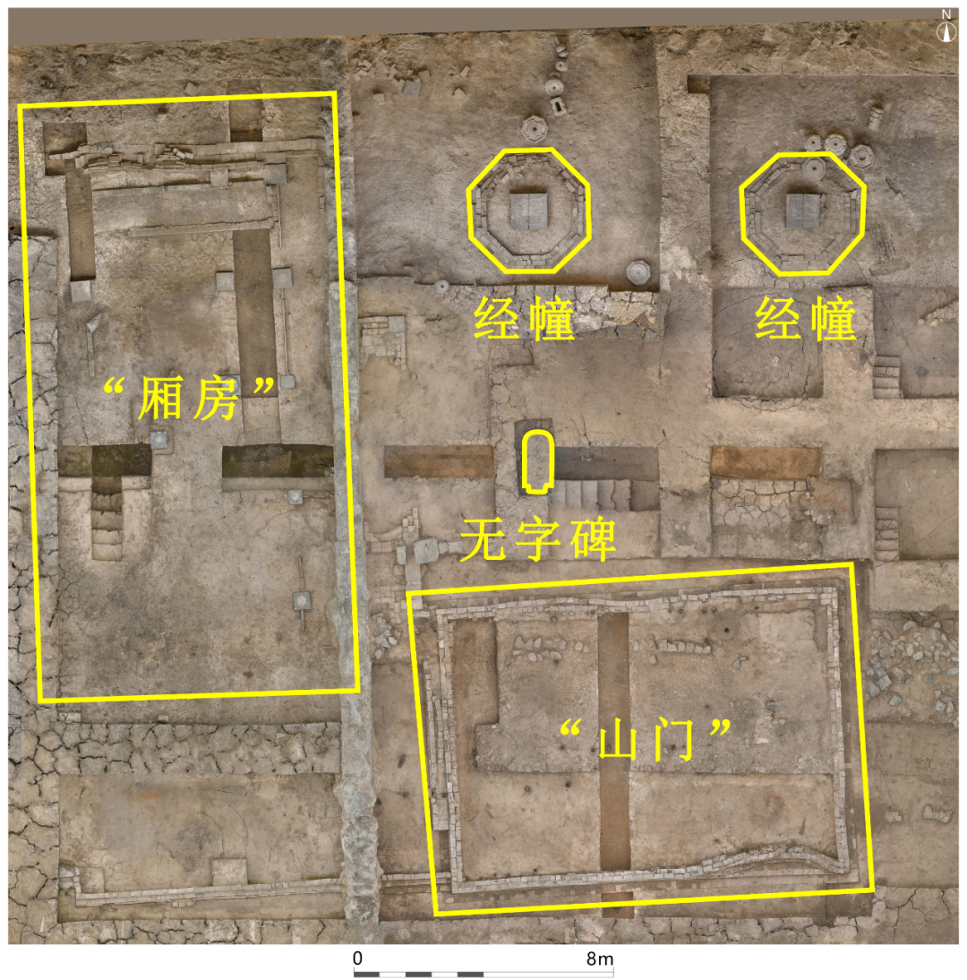 此外,发掘西区还发现了一座较大规模的宋代佛寺建筑基址,由山门、厢房和2组经幢组成。房址内发现4件精美石雕柱础,两经幢基座周边清理出13件精美佛教经幢石雕构件。