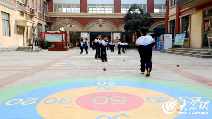 教室里,两名学生正在对弈一款学校自创的泰山文化主题“童年有座山”桌游,专注的神情吸引了不少同学围观;教学楼走廊上,学生们正轻快地踢着系绳的毽子,笑声不断;操场上,孩子们或进行小碎步训练,或尝试软式飞盘,或组队参与开合跳接力……每一个角落,都洋溢着运动的活力。