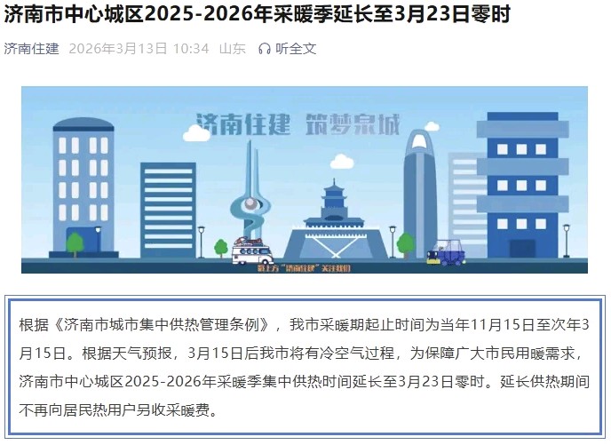 3月13日,记者在济南市住房和城乡建设局官网注意到,该局发布《济南市中心城区2025-2026年采暖季延长至3月23日零时》通知公告: