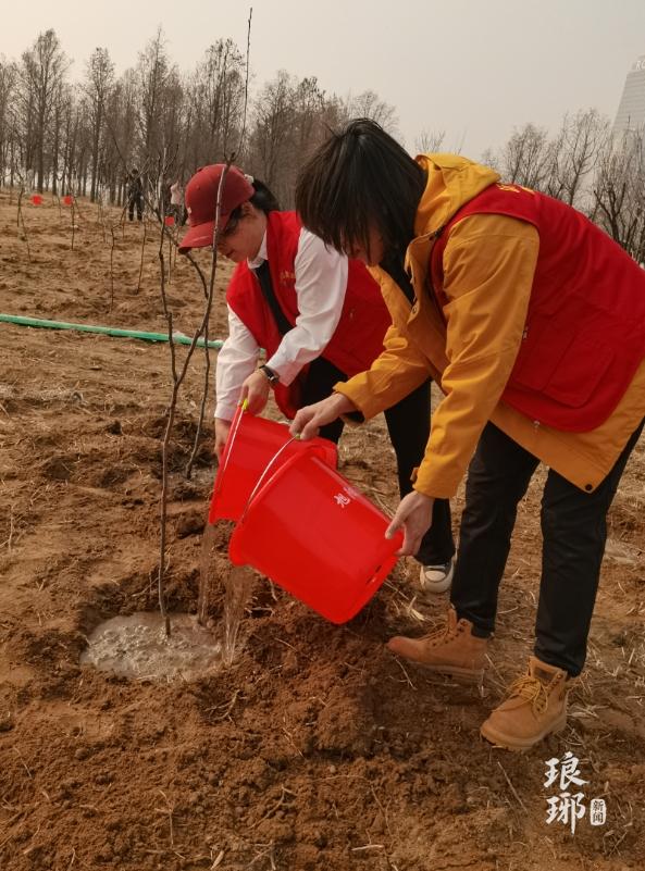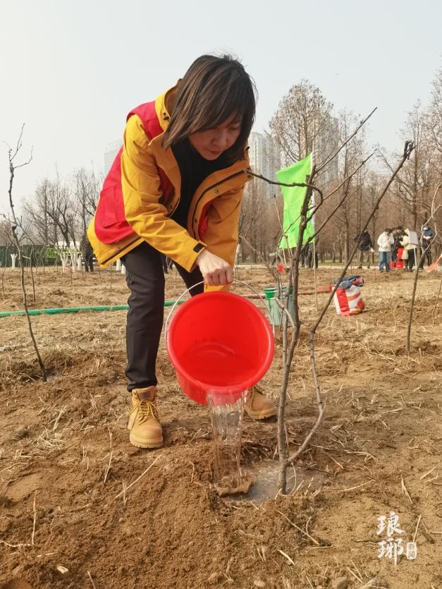 一大早,滨河景区在“植树节”的氛围中热闹起来。红色的水桶在人影间晃来晃去,铁锹一头扎进土里,“咔嚓”一声带出满满一铲泥土。