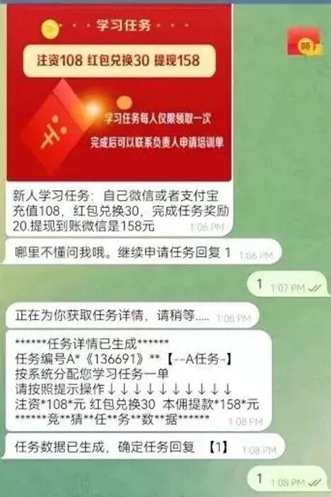 随后的几次投注,熊先生不再中奖。当他开始犹豫时,负责人抛出了更诱人的计划:“只要完成三次‘注资’任务,就能进入精准荐号群,群里推荐的号码中奖概率更大!而且每次‘注资’,都有高额现金奖励!”