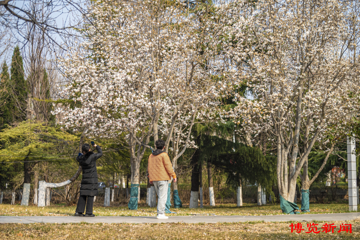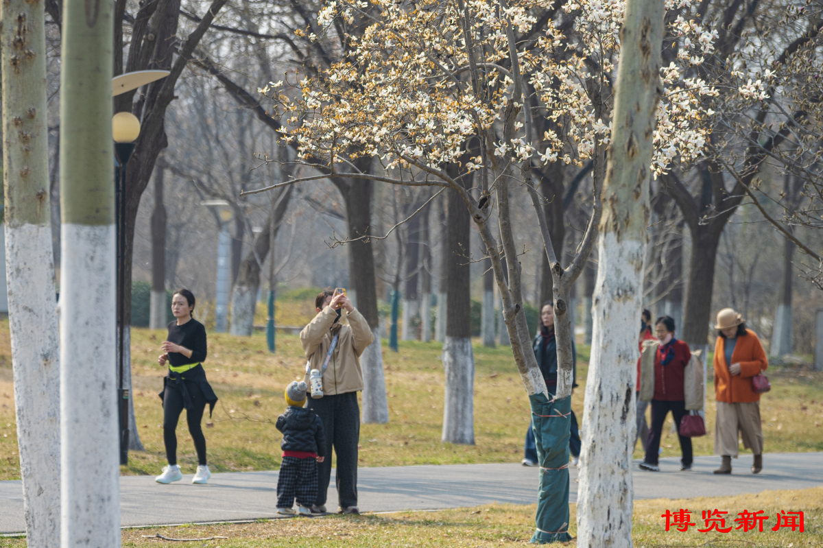 近日,随着气温回升,淄博市各公园、游园的玉兰花渐次开放。玉兰花如“玉雪霓裳”,形有君子之姿,似朵朵云霞簇立枝头,优雅而烂漫。3月10日,市民在淄博市植物园驻足赏花