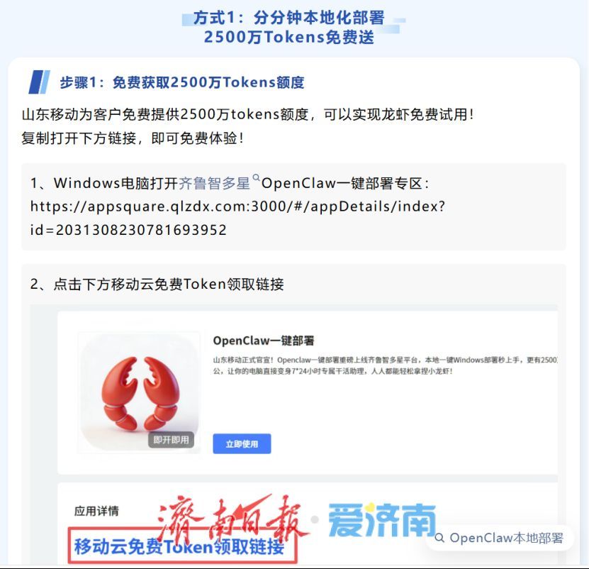 就在3月10日,中移齐鲁创新院上线了云端部署的Open Claw专区,帮助用户“一键部署”Open Claw,云端部署免配置即用,用户还能免费领取2500万Tokens。云端部署可以不读取用户电脑的文件,有助于防止信息泄露等隐患。