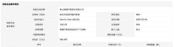 根据挂牌信息显示,泰山玻璃纤维南非有限公司,注册于南非共和国约翰内斯堡,注册时间2005年5月4日,注册资本100兰特(约人民币42元),主要从事玻璃纤维毡制品的生产与销售;由泰山玻璃纤维有限公司(以下简称:“泰山玻纤”)与南非戴尔塔复合材料有限公司,各持股50%。